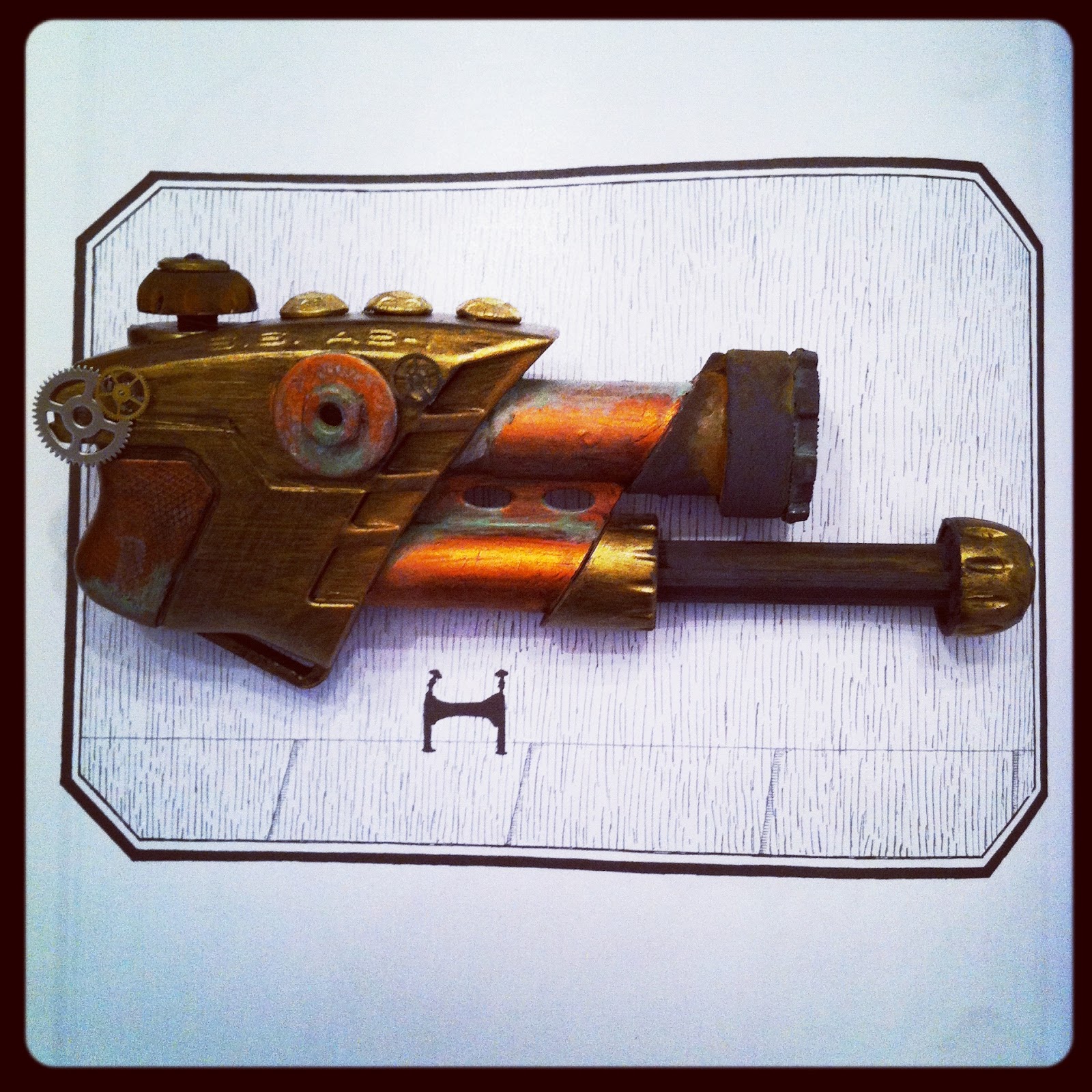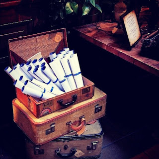 We had all manner of inventive gadgetry and mechanical mayhem, starting with blueprint wedding programs, all rolled and presented in a pile of vintage suitcases.