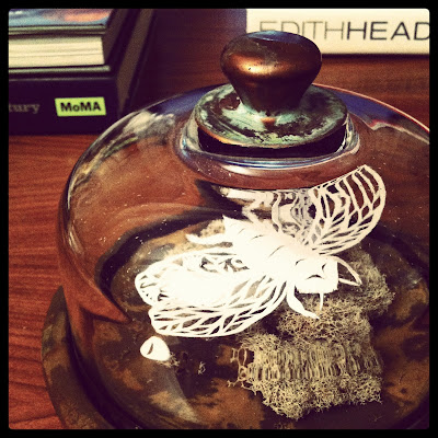 ... "Butterfly Under Glass," an intricate papercut fantasy butterfly perched on a bed of moss under a glass and copper dome,
