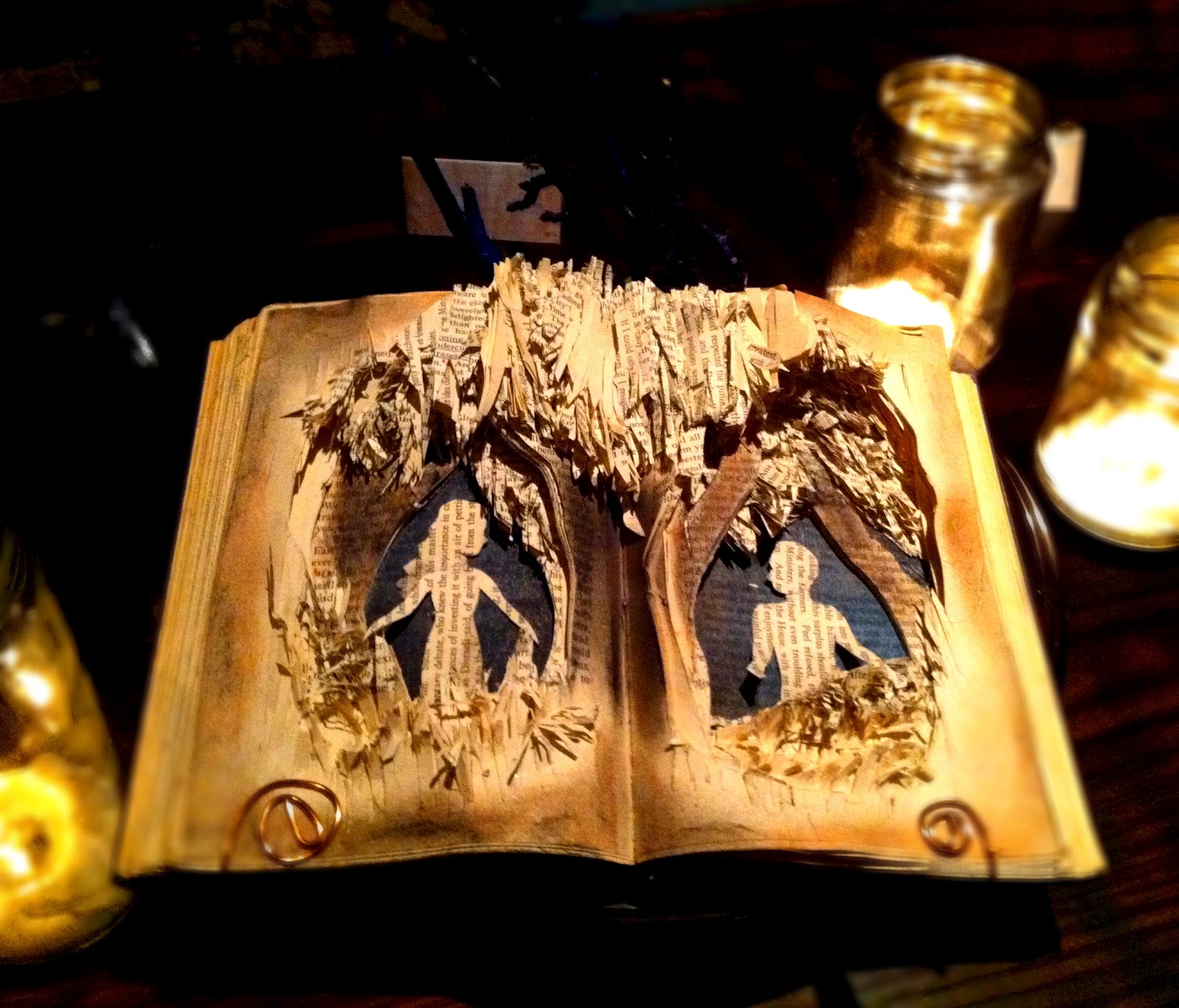 ... and "Literary Garden of Eden," carved from an old Benjamin Disraeli biography, featuring Adam, Eve, and the Tree of Life.